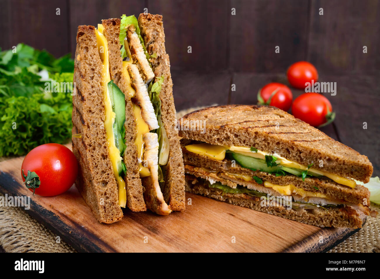 Delicious Club Sandwich With Rye Bread Chicken Cheese Cucumbers Greens On A Dark Wooden Background Stock Photo Alamy